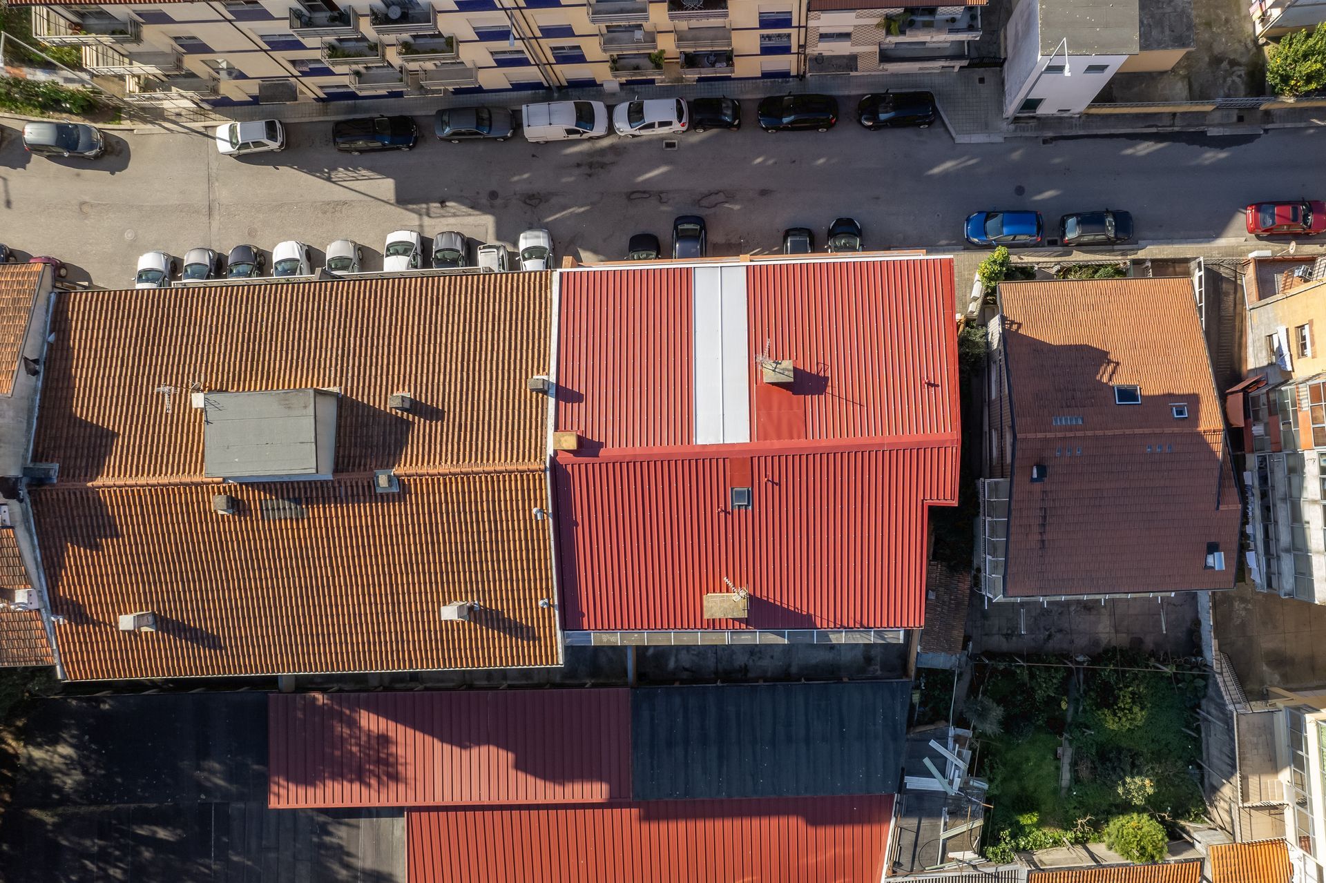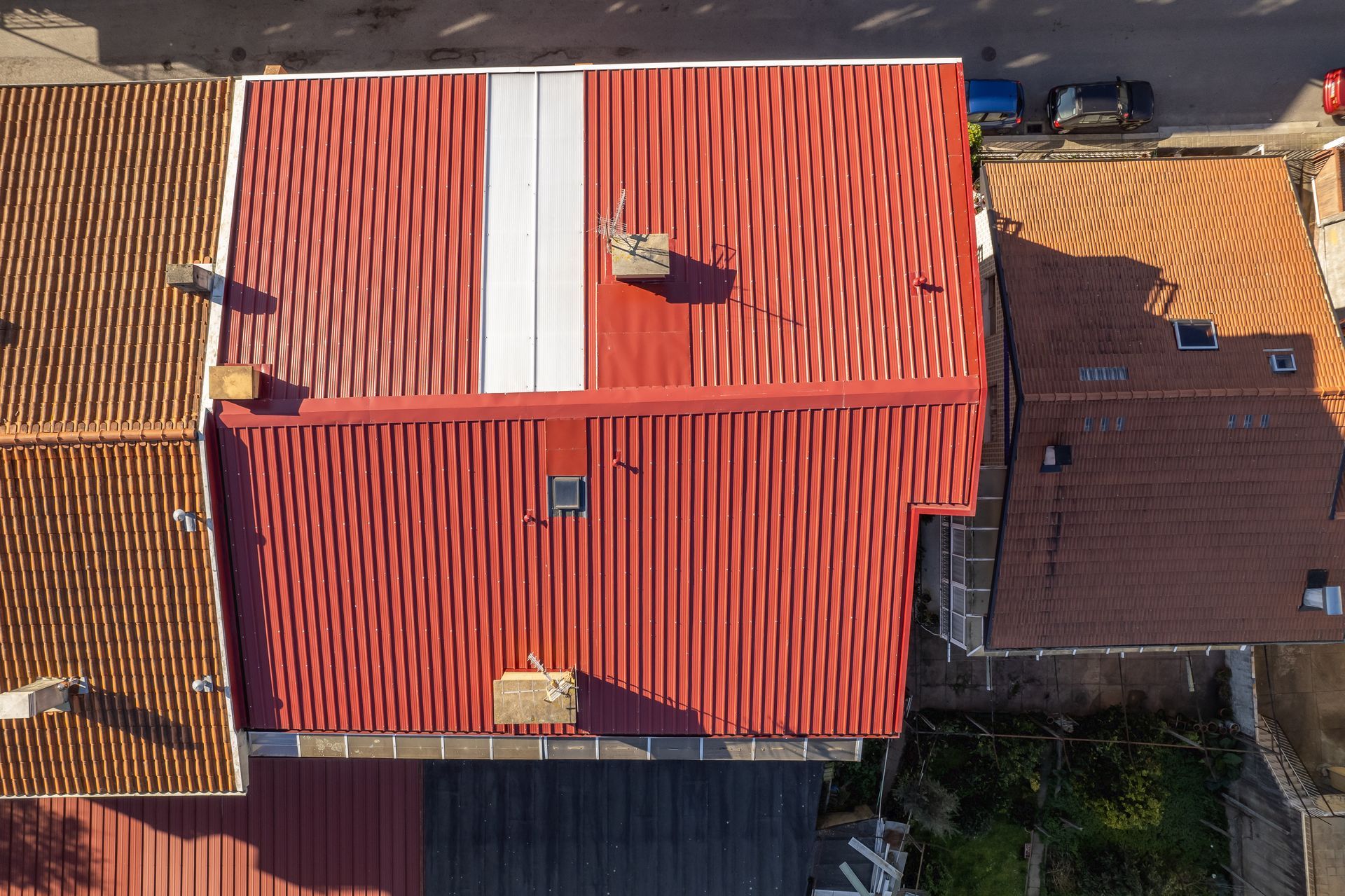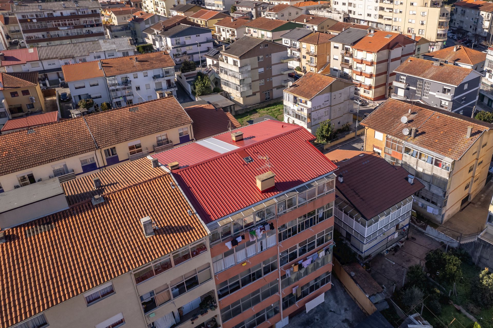 A nossa equipa fez a instalação de painel Sandwich 5 ondas em vermelho RAL3009 e caleiras em COR BRANCA. Foram aplicadas caleiras fechadas, típicas de coberturas em painel sandwich.