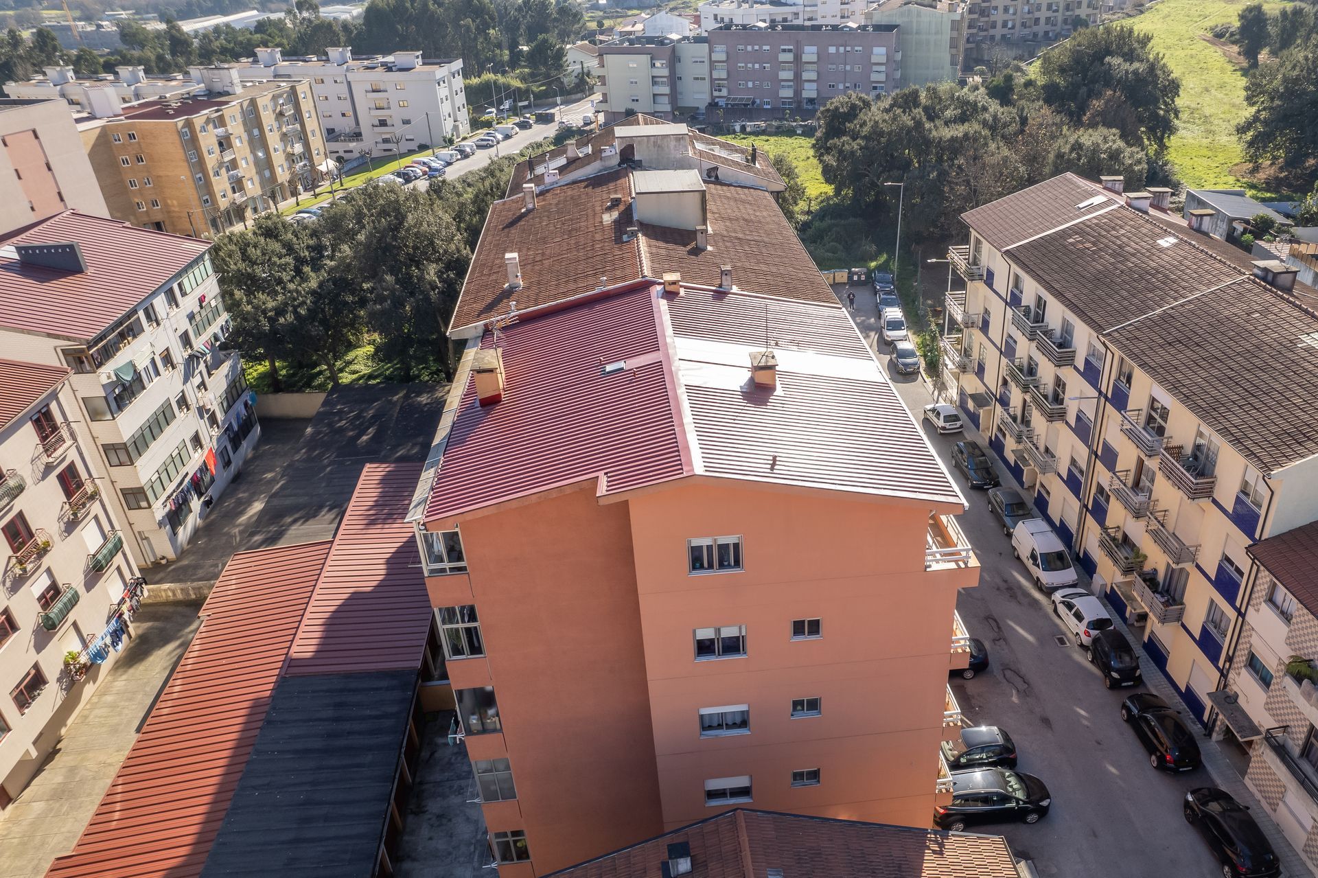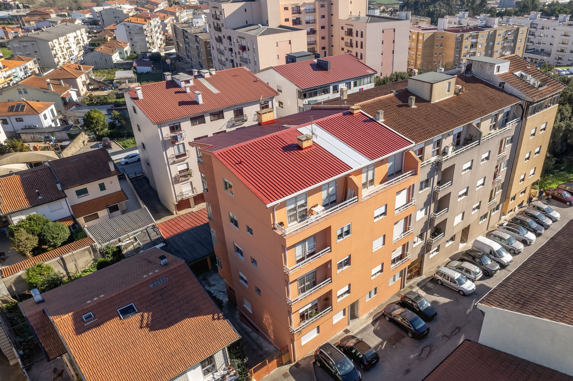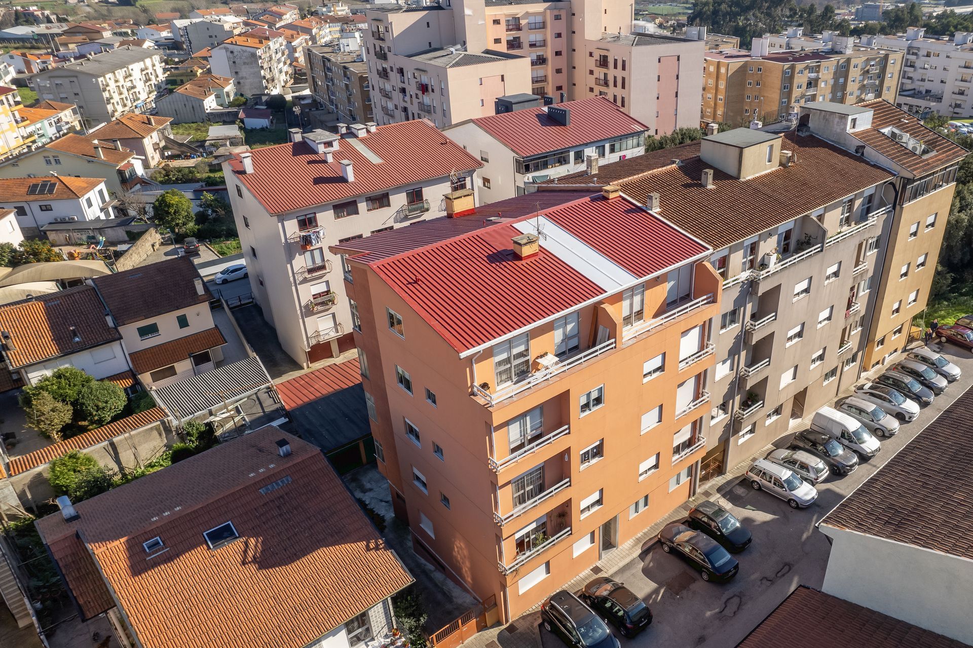 A nossa equipa fez a instalação de painel Sandwich 5 ondas em vermelho RAL3009 e caleiras em COR BRANCA. Foram aplicadas caleiras fechadas, típicas de coberturas em painel sandwich.