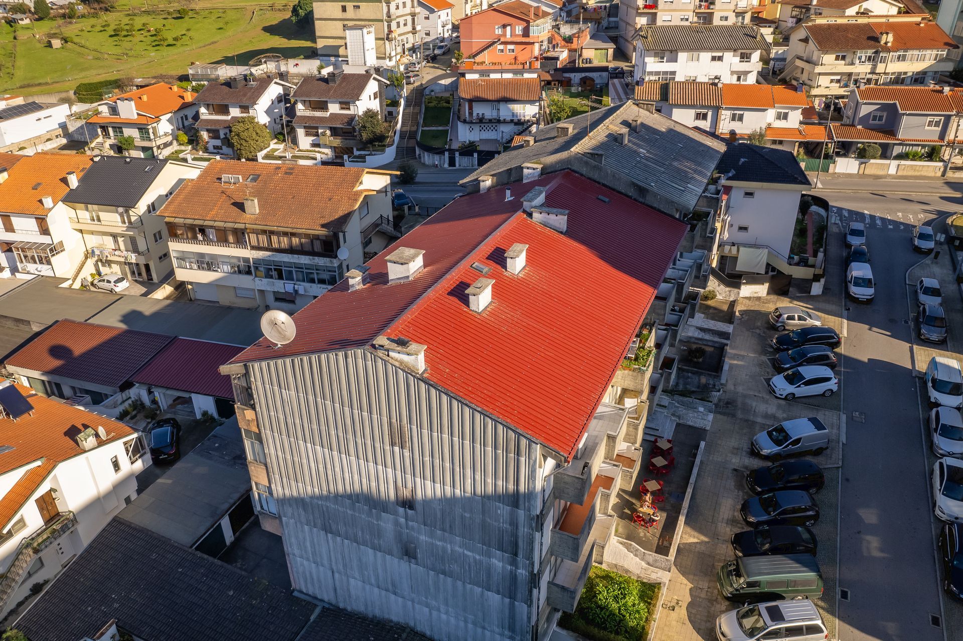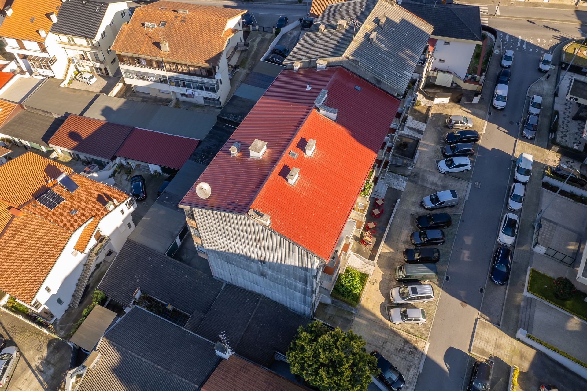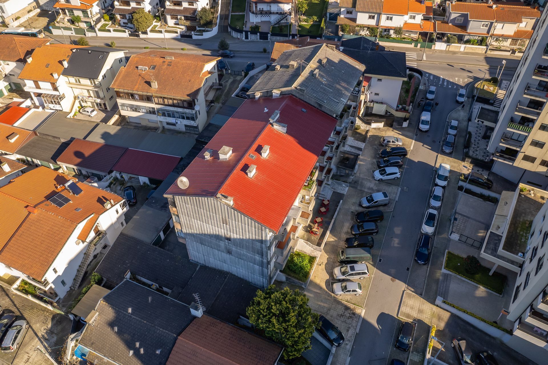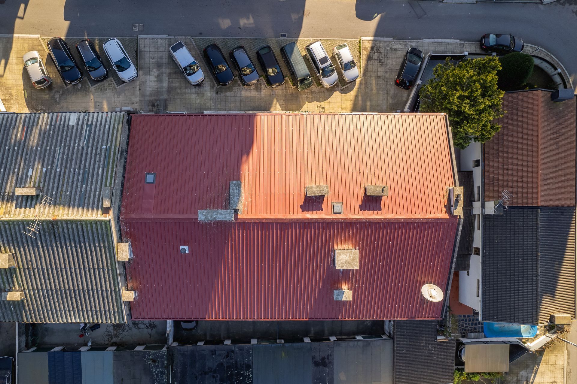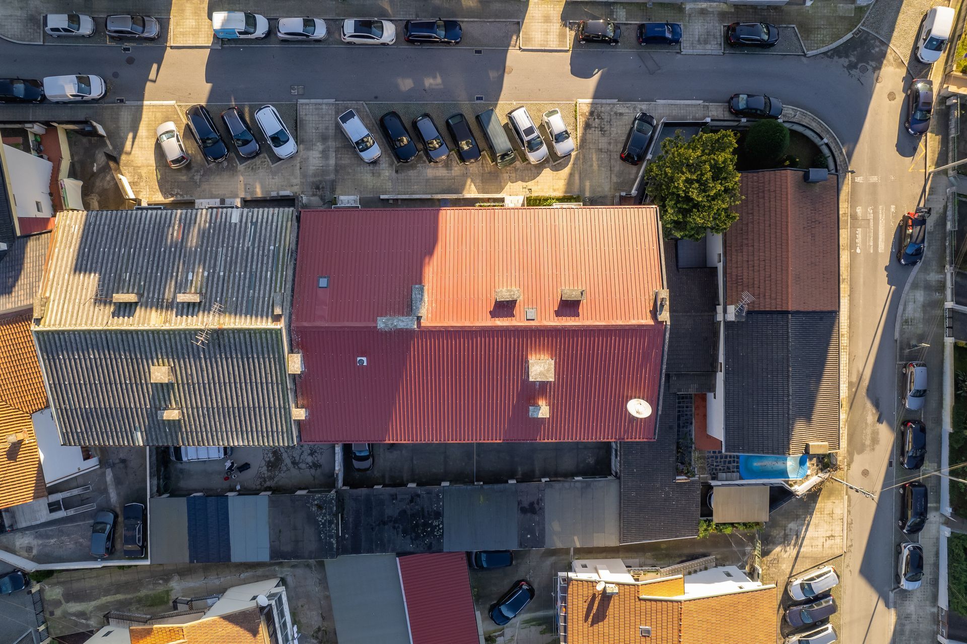 Condomínio localizada em Ermesinde posteriormente com telhado em fibrocimento. Substituimos a cobertura para Painel Sandwich de 5 Ondas 30mm RAL3009 cor vermelha.